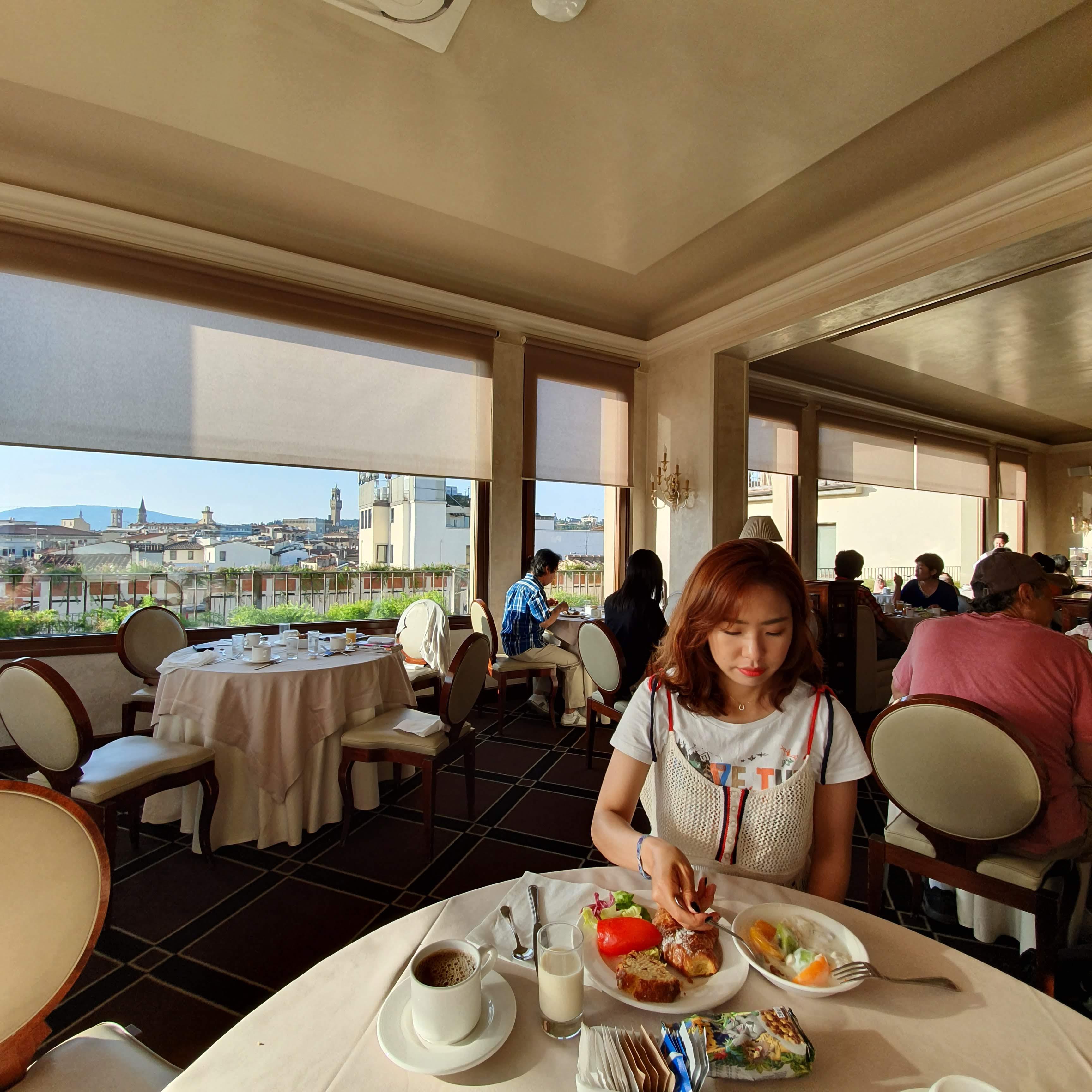 <그랜드호텔발리오니>를 선택한 가장 큰 이유는 조식이다. 조식을 먹는 장소에서 피렌체 두오모가 보인다는 말에 주저없이 선택했다. 조식을 먹으면서 두오모를 본다니... 생각만해도 낭만적이었다. 명당을 잡으려면 6시부터 시작되는 조식 레스토랑으로 빠르게 움직여야 했다. 왠걸 가기 전에 팁은 다 알아두고 엄마아빠와 같이 움직이는 바람에 바로 창가 자리는 잡지 못했다. 아무렴 어때 어느자리에나 햇살이 내리쬐고 두오모가 보였다.